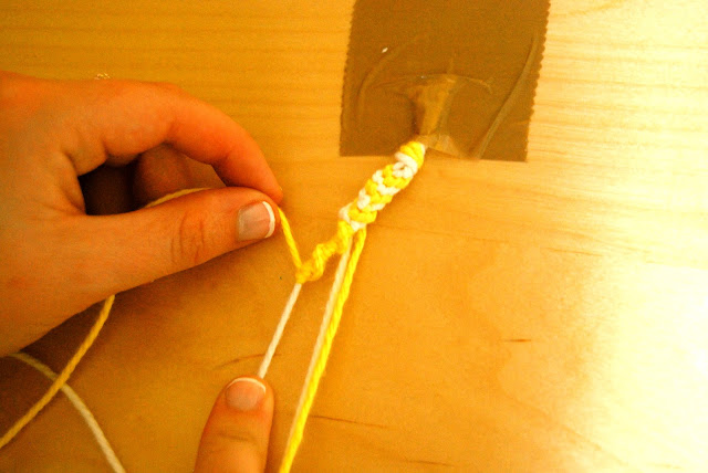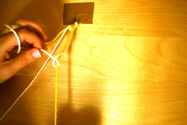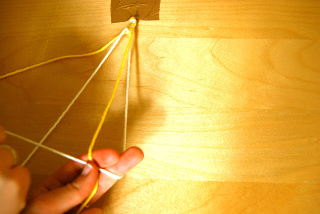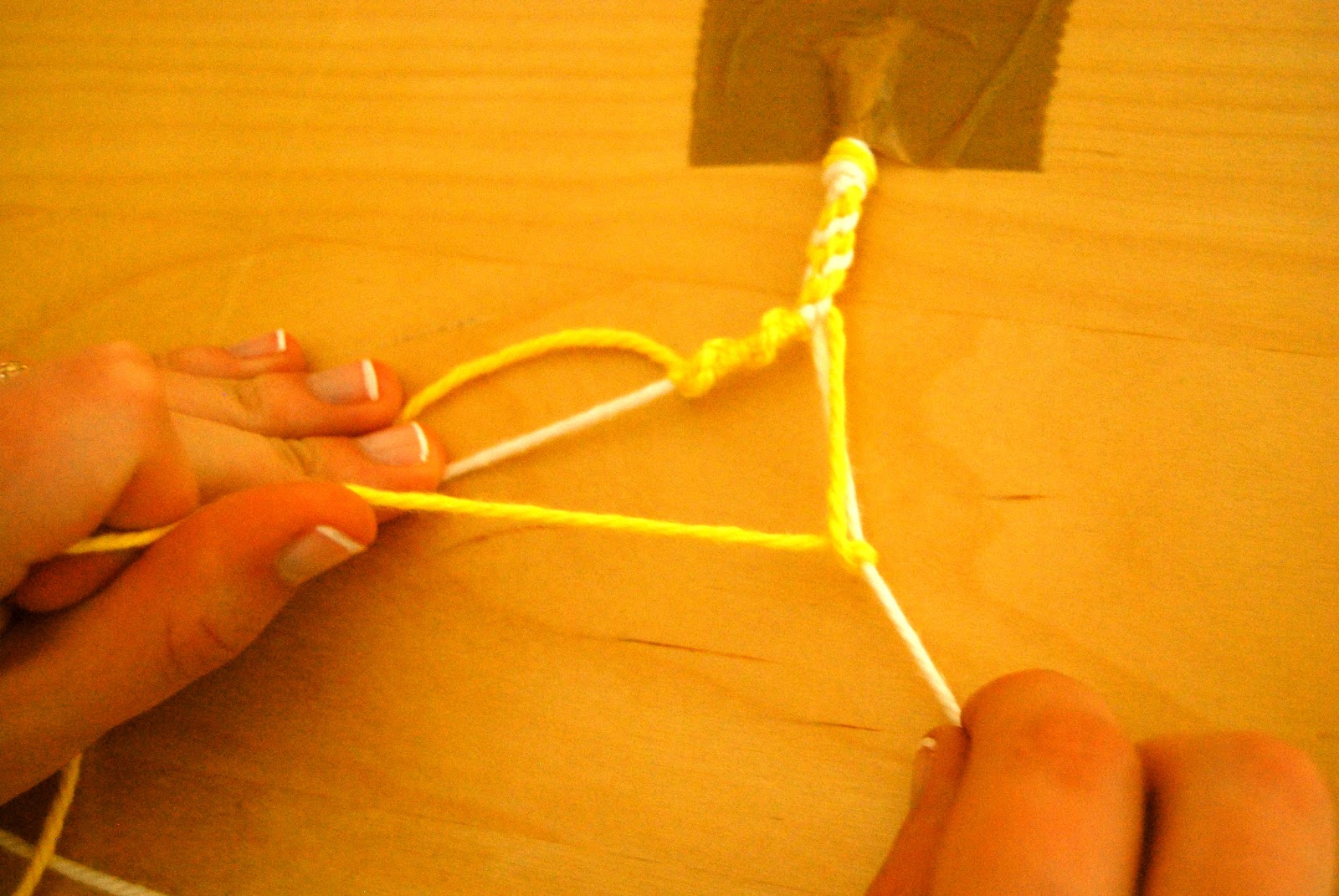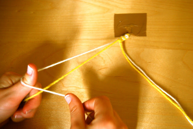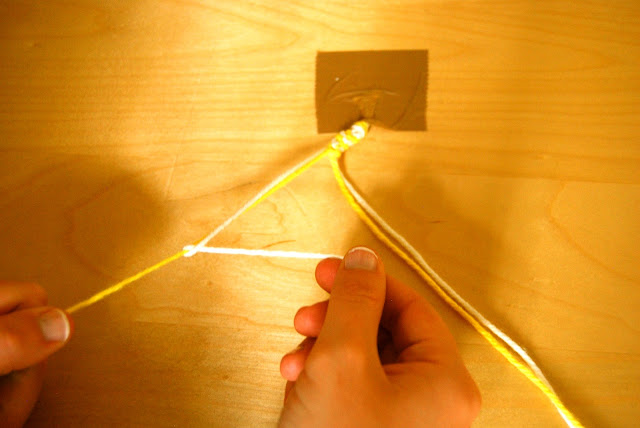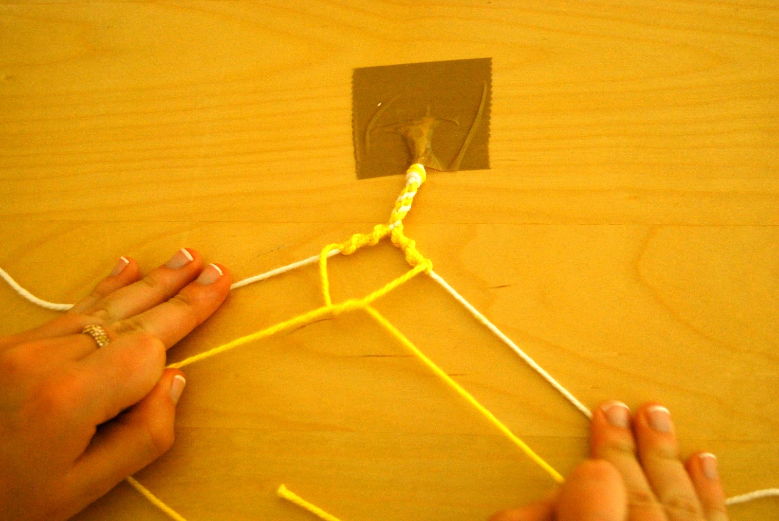 1) Coge 2 grandes hilos de algodón, doblarlos haciendo un nudo y pegarlos a la mesa. Después, sepáralos haciendo dos pares.
