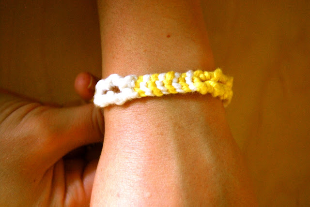 6) Por fin, cuando terminas las 2 pares circulares, haz un nudo con los 2 hilos exteriores (aquí amarillo) para seguir haciendo la otra parte. Poco a poco, vas alternando las dos etapas.